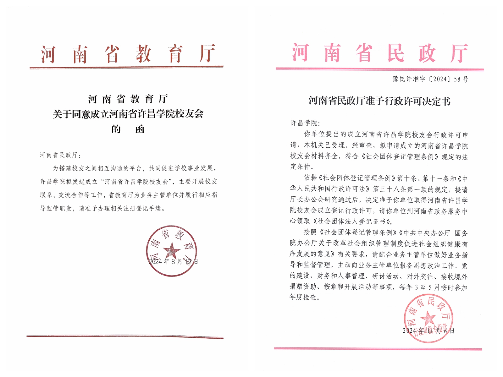 近日,在学校各项事业奋力迈进之际,在广大师生、校友的热切期盼中,河南省民政厅下发了“河南省民政厅准予行政许可决定书”【豫民许准字(2024)58号】文件,并颁发了河南省yl34511线路中心校友会“社会团体法人登记证书”。至此,yl官网校友会成为由省教育厅批准、省民政厅注册登记、具有法人资格的合法社团组织。