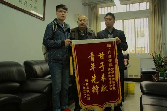 11 月19日 ,为感谢yl官网文学与传媒学院院学生在许昌高铁站的志愿服务工作,许昌市高铁站负责人杨凯向文学与传媒学院送来感谢信和“青年先锋,甘于奉献”的锦旗。