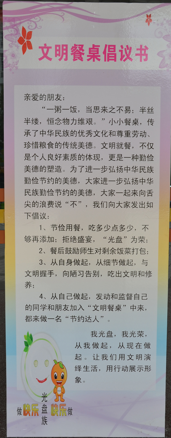 排队刷卡打饭、量“力”用餐不剩不丢、饭后自觉归放餐具、买“半份菜”保证营养又不浪费……勤劳节俭是中华民族的传统美德,在许院校园中勤俭节约的文明之风已渐成风尚。为号召全体师生以勤俭节约为时尚,倡导餐桌文明之风,10月30日——11月12日yl官网组织开展了文明餐桌活动。