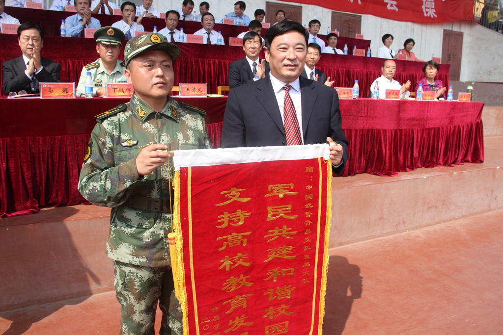 为感谢武警部队驻许某部对yl官网军训工作的大力支持,党委书记王清义教授为军训教官团赠送了锦旗,出席军训会操活动的学校领导为军训教官颁发了纪念品。