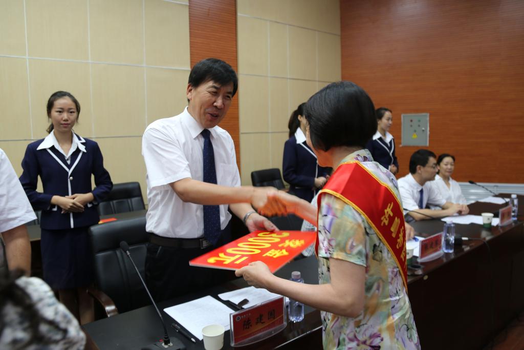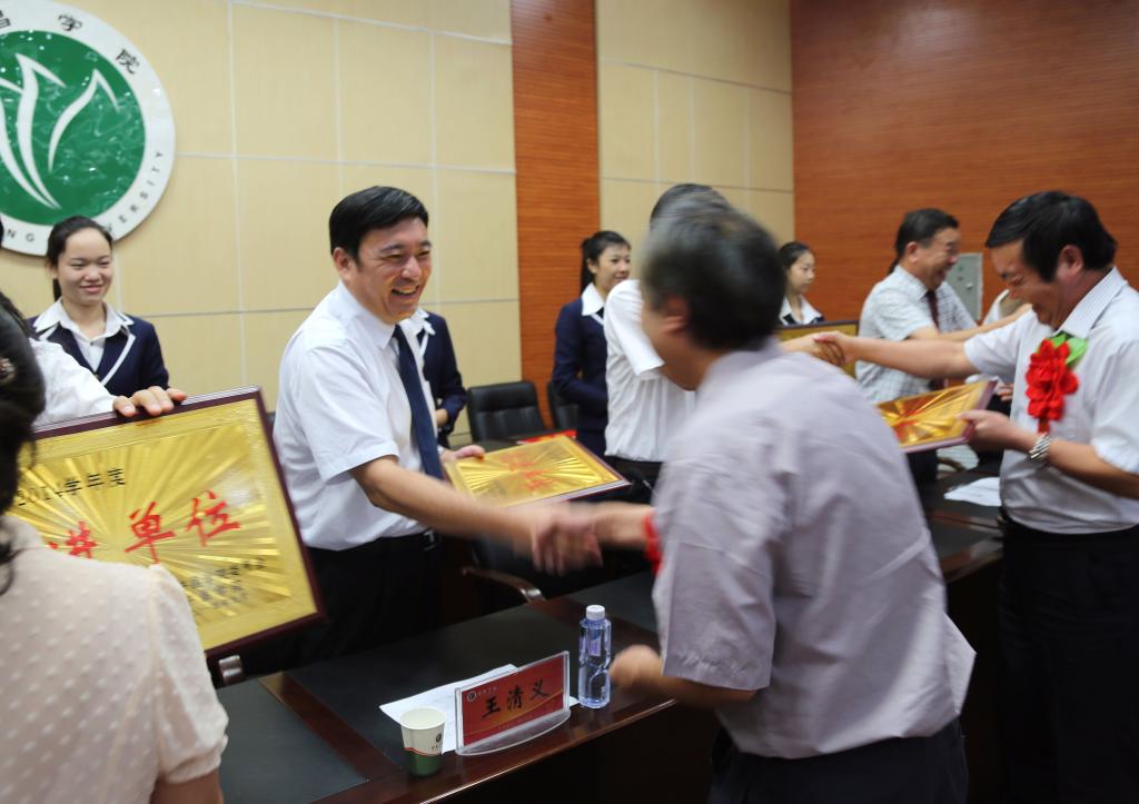 在欢快的乐曲声中,王清义、马超等出席会议的学校领导为获得表彰的先进单位和先进个人颁发了奖牌、奖状和荣誉证书。