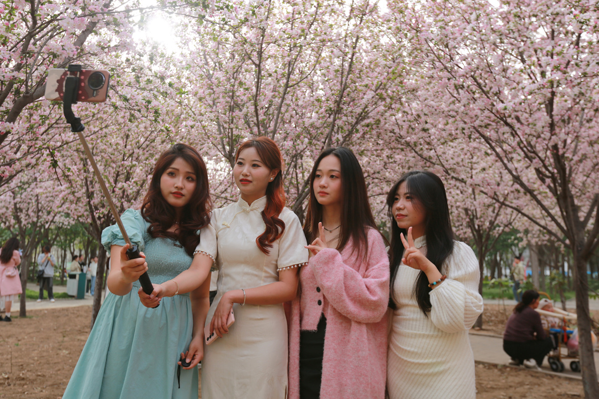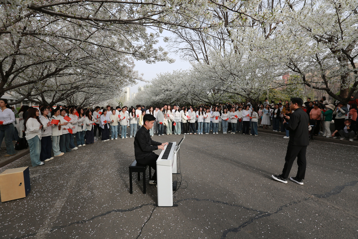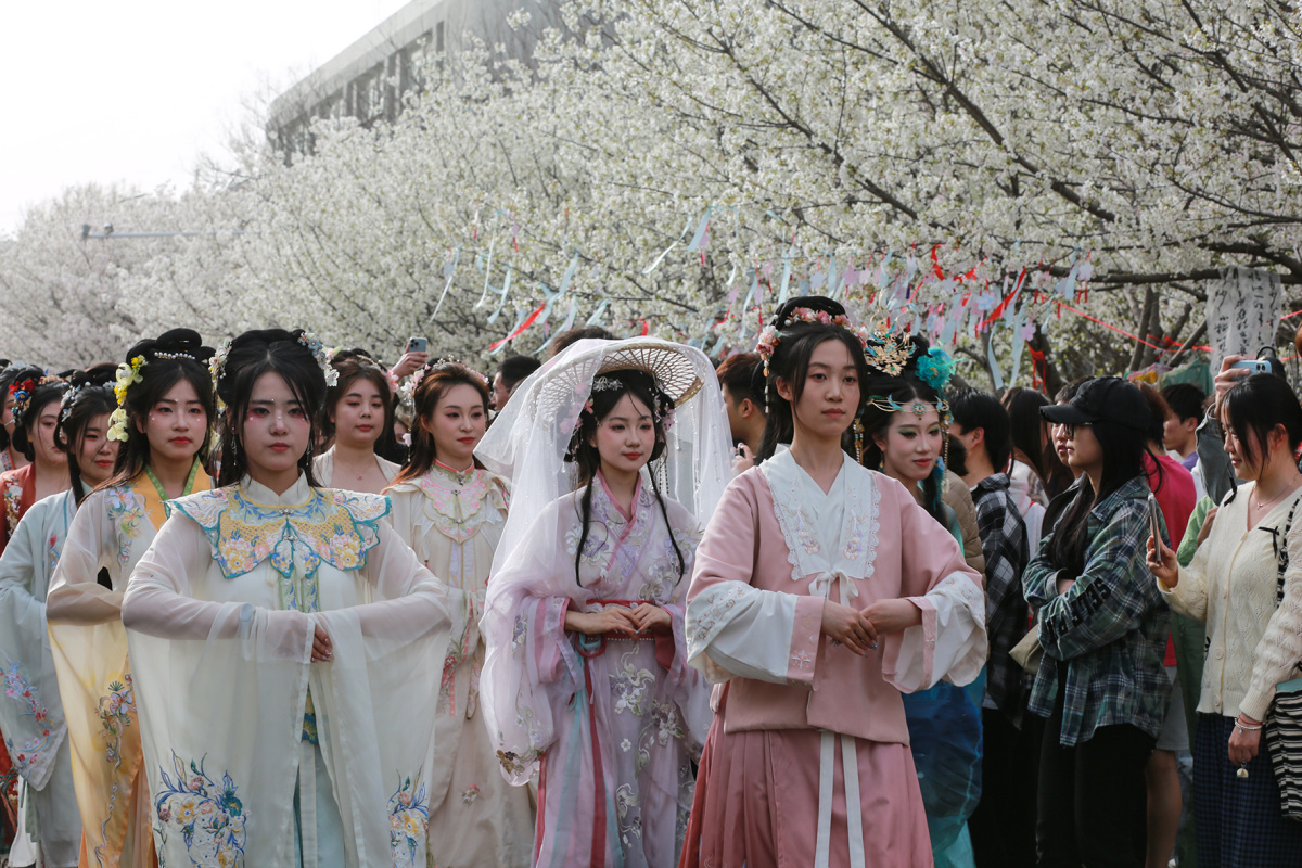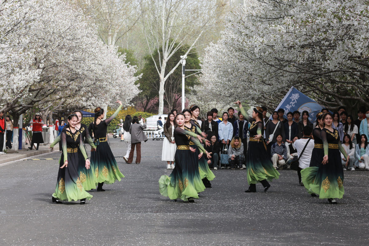樱花树下人头攒动,年轻的学子们用丰富多彩的活动,尽情绽放青春。“樱歌漫舞”“樱韵声华”等歌舞快闪节目用歌曲串烧、舞蹈表演、合唱等方式演绎青春活力和青年自信,展现当代大学生昂扬向上的精神面貌。“樱华古韵”国风雅集、“武舞樱风”非遗舞动、“樱香春韵”技艺展示等活动将汉服走秀、社火表演、非遗技艺体验等古今融合,展示中华优秀传统文化的独特魅力和创意传承。